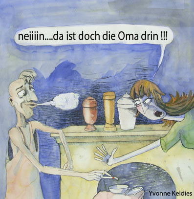 Den dritten Cartoon finden Frauen wahrscheinlich witziger als ich; ich habe mit Auskämmen eigentlich nicht so Probleme (und dazu mit fortschreitender Zeit immer weniger). Und der Gag mit der Urne von der Oma zündet bei mir wieder nicht so, weil er irgendwie zu naheliegend ist. Außerdem: So ein Ding ist doch normalerweise gut verschlossen, oder? Warum hat sich der Mann die Mühe gemacht, sie zu öffnen, wenn er bloß mal eben eine rauchen will? Oder auch: Warum steht die Urne eventuell offen in der Gegend rum? In dieser Situation steckt vielleicht noch ein besserer Witz drin.