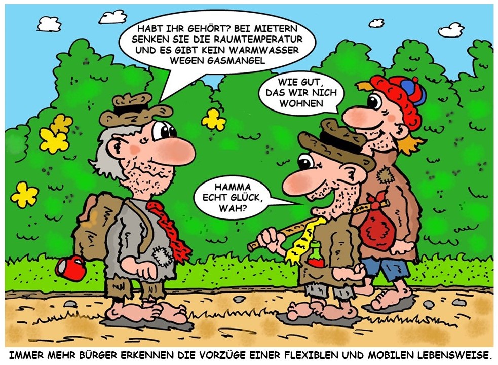 Der Gedanke ist nicht schlecht: Wie sehen die Energieprobleme aus Sicht von Leuten aus, die ganz andere Probleme haben? Ich würde die aber nicht sagen lassen: "Da wir nicht wohnen...", denn das sieht man ja. Eher was Ironisches in der Art von: "Das ist wirklich hart für die." Die Bildunterschrift finde ich überflüssig.