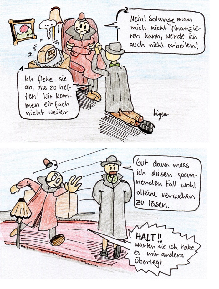 Das besondere daran: Dieser Comic wird eine Kims-Comiczeichenkurs-Forenexklusive Fortsetzungsgeschichte von zwei Zeichnern. Ich, Fraro, werde den Part des "Bösen" übernehmen, ein Verbrechen begehen- und dann hoffen, daß Larry mir nicht auf die Schliche kommen wird. Ich zeichne also ein Panel, dann Jockey, dann wieder ich, dann wieder Jockey... solange, bis einem die Einfälle ausgehen oder die Idee sich totgelaufen hat. Wir sprechen weder Plot noch Ideen ab, wir reagieren einfach immer möglichst spontan (und so, wie wir Zeit haben) auf den Cartoon des anderen. Jockey weiß also nicht, wie ich gleich eröffnen werde- und ich habe keinen Dunst, was er daraus machen wird. Ob wir jeweils mit einer, zwei oder mehr Zeichnungen antworten, bleibt uns selbst überlassen.