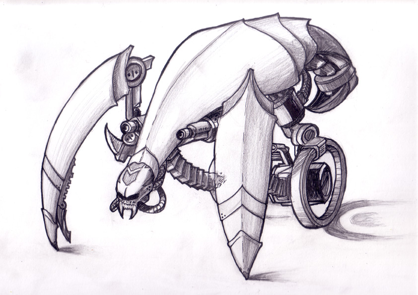 NEulich habe ich was geskribbelt, wo auch ein Robotervieh vorne zwei Beine hatte und hinten ein Rad. (Das muss echt cool aussehen, wenn das Biest gallopiert :D )