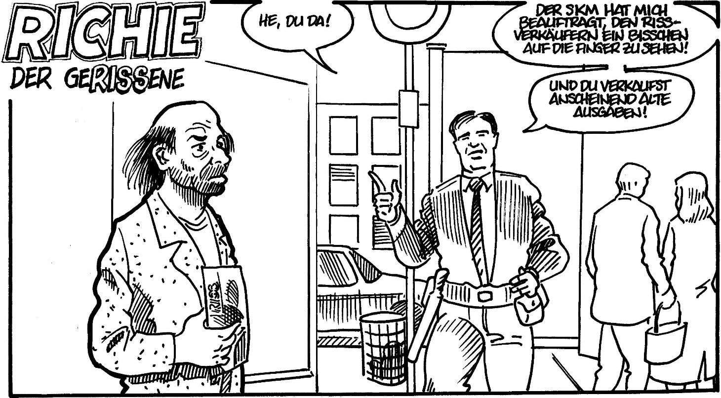 Ja, es gibt eben immer wieder Ärger: Die Leute horten RISS-Hefte und verkaufen sie untereinander weiter, oder sie verbinden das Hefte-Verkaufen mit Betteln oder wenden zumindest zweifelhafte Heftverkaufs-Methoden an. Der Security-Mann sagte mir, er könne solche Dinge in der Regel einfach durch seine Präsenz unterbinden. Manche Verkäufer wissen auch nicht so genau, was sie dürfen und was nciht. Da kann er dann mit ihnen reden. Ich wollte mir aber gern eine kleine Handlung ausdenken, die lustig ist.