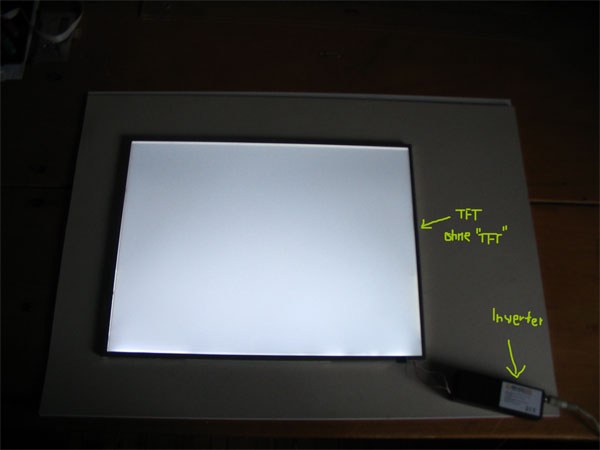 Ich hab bei einem defekten TFT Display die gerissene TFT Einheit gegen eine gleichgrosse einfache Glasscheibe ausgetauscht. Anschliessend hab ich eine Buchse passend zu einem 12V Netzteil an den Inverter angelötet und die CCFL an den Inverter angeklemmt.