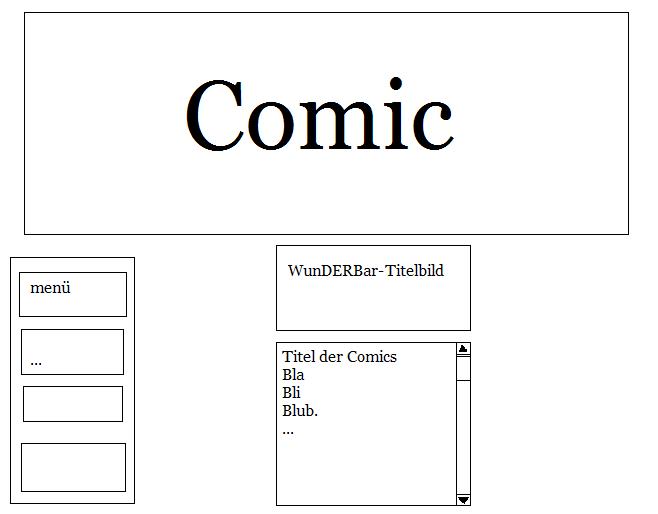 Ich brauche Hilfe an meiner Homepage und da ich mich mit HTML und Java und soweiter null auskenne, wäre es nett wenn sich hier jemand findet, der mir weiterhelfen kann. Im Ahnag habe ich mal aufgemalt, wie es aussehen soll später. Ich habe von mehreren Seiten bereits gehört, dass es wohl keine große Arbeit wäre, das zu realisieren. Da ich aber so gar keine Ahnung habe wende ich mich an euch, die ihr alle so schicke und schnieke Seiten habt. Wenn also jemand ein wenig Zeit und Lust hat mir den Gefallen zu tun (und vielleicht etwas geduld mit mir beim erklären, wie ich dann eigene Comics auf die Seite bekomme) wäre ich sehr dankbar!