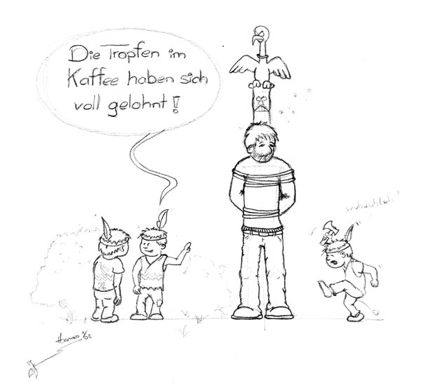 PS: Jetzt kam dein Kaffeecomic dazwischen und ehrlich gesagt: Die Pointe versteh ich nicht. Wer hat den Kaffee getrunken, der wilde Kleine oder der Papa oder der Geier auf dem Marterpfahl ;)
