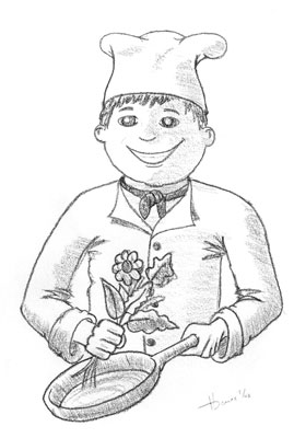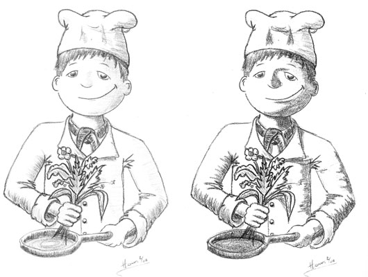 hm, also wenn der Koch locker sein soll, setz ihm die Mütze doch etwas schief auf, sodass sie verrutscht aussieht. Oder klemm ihm ein Gänseblümchen hinters Ohr.