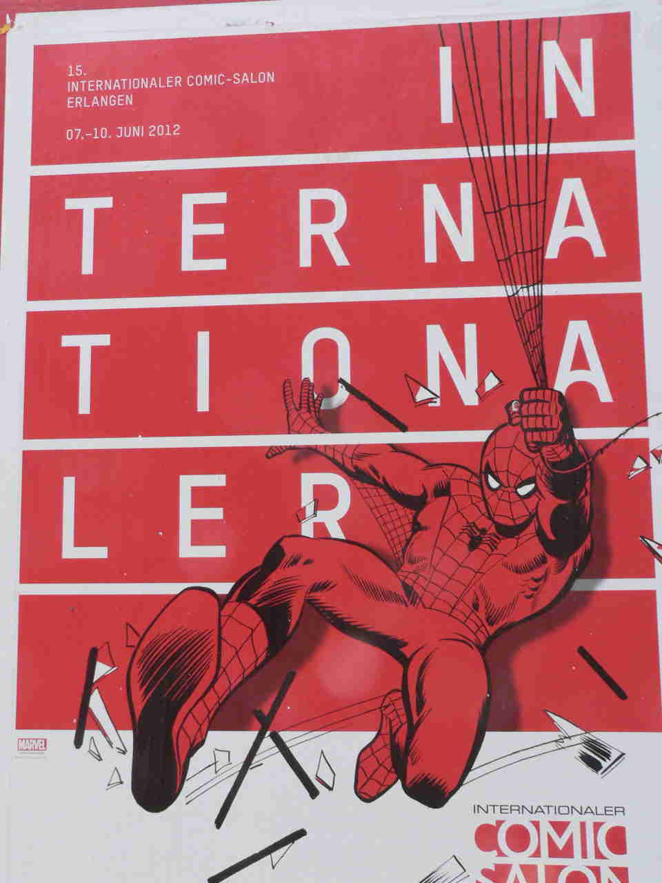 Bild drei vermittelt einen Eindruck von der Erlanger Innenstadt (der einstigen Neustadt). Aber zurück zur Kongreßhalle: Von der Messe und der Comicbörse habe ich noch keine vorzeigbaren Fotos zu bieten – sie finden aber an allen vier Tagen statt. Bild vier zeigt eine der Ausstellungen, die zum 50. Geburtstag von Spider-Man.