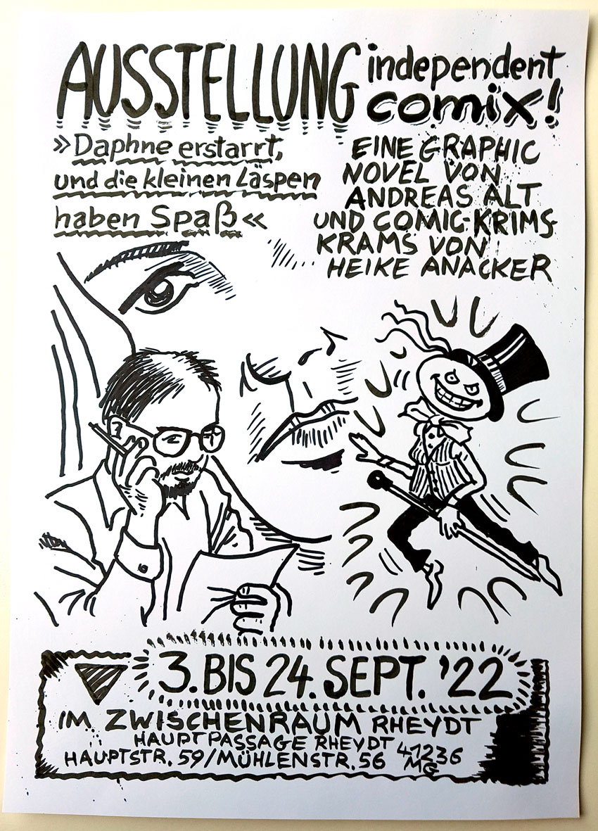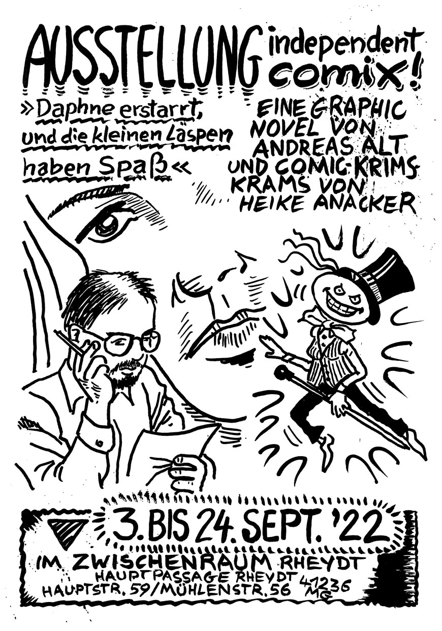 Im September gibt's dort eine kleine Ausstellung von Andreas Alts "Daphne erstarrt" und Comic-Kleingedöns von Heike Anacker. Am Samstag, 3. September, geht's los. Ab 11 Uhr vernissagieren wir auf die schlichte Art mit Trinkbarem und Knabberzeugs und - wenn's klappt - mit Live-Musik. Auch sonst ist an diesem Tag viel los im Stadtteil Rheydt und quasi vor der Tür: neben dem üblichen Wochenmarkt ein früher Flohmarkt und ab späterem Nachmittag die Kulturnacht. Deshalb wird die Ausstellung auch zu später Stunde noch zugänglich sein, und die Künstler*innen werden - je nach Kondition - anwesend sein.