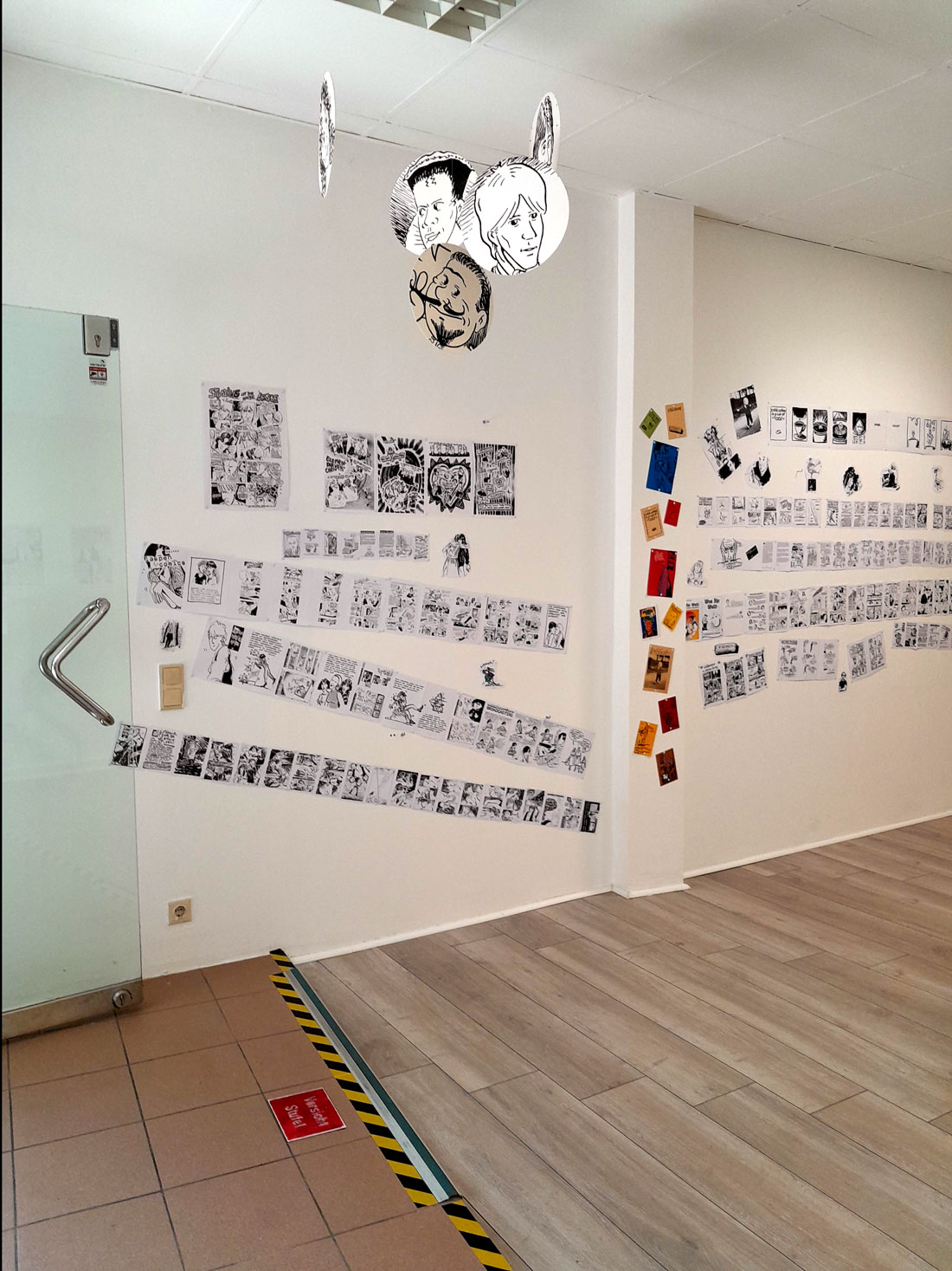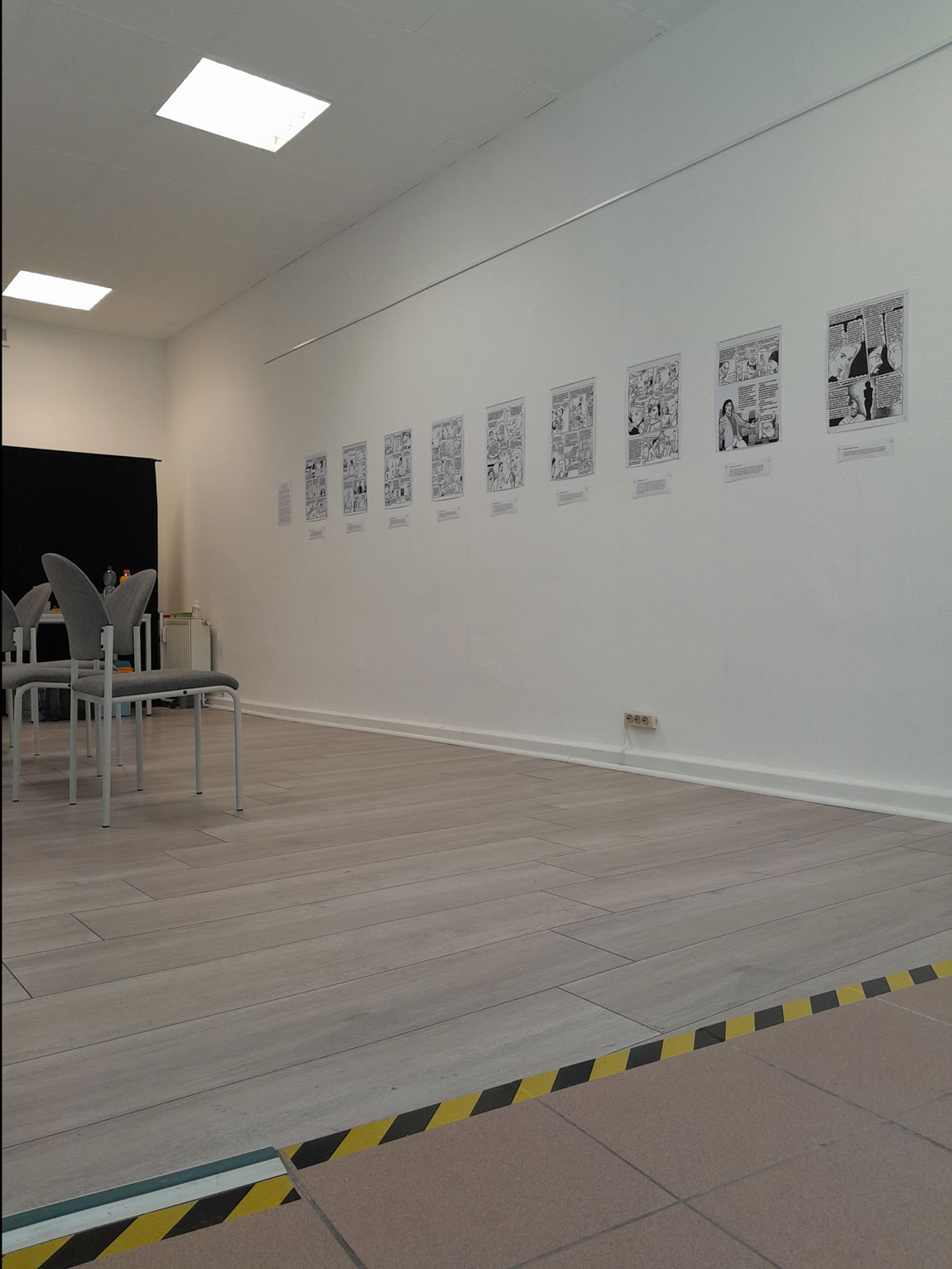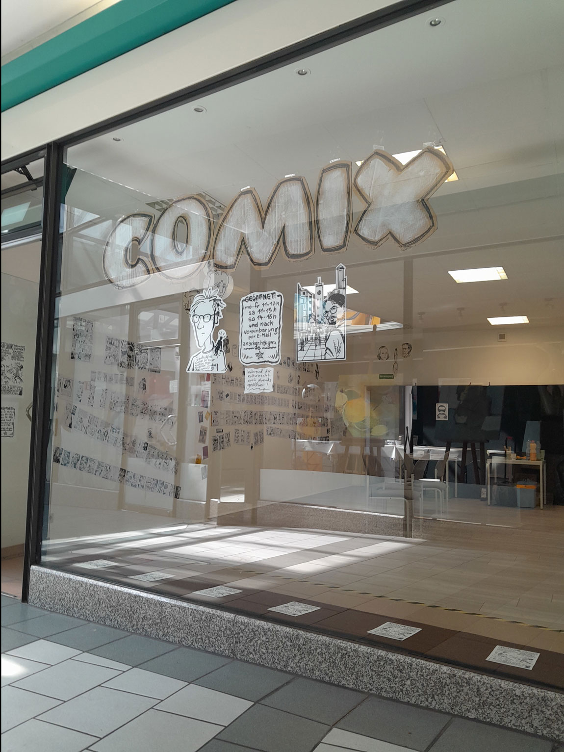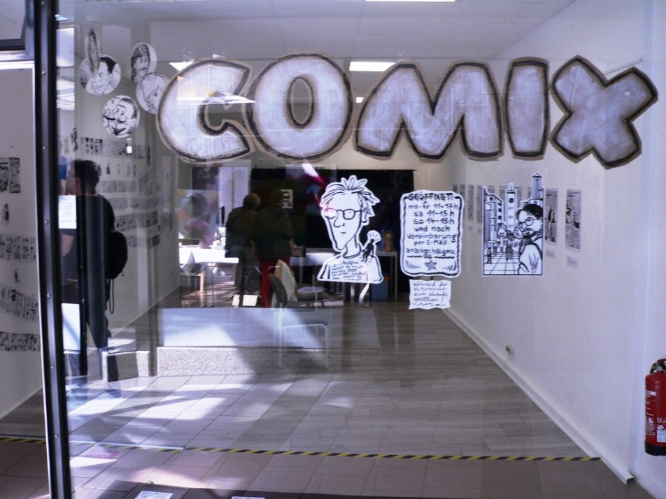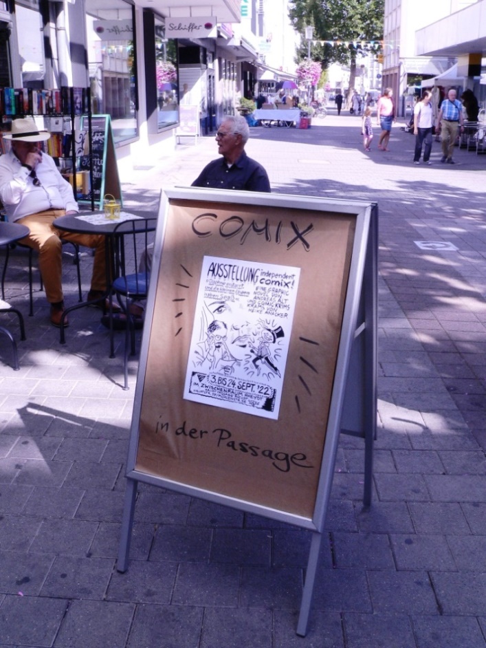 Die Hauptpassage mitten in Rheydt (was ein Stadtteil von Mönchengladbach ist, früher eine eigene Stadt) ist vorne an der Fußgängerzone mit einem Cafè bestückt, an das noch ein Antiquariat angeschlossen ist. Alle übrigen Läden in der Passage stehen derzeit leer, das heißt, drei von ihnen werden für Kunstausstellungen genutzt. Weil es Zwischennutzungen sind, bis – hoffentlich – wieder ein Geschäft kommt, heißt dieser Bereich „Zwischen-Raum“. Eine der Ausstellungen ist die Comix-Ausstellung.