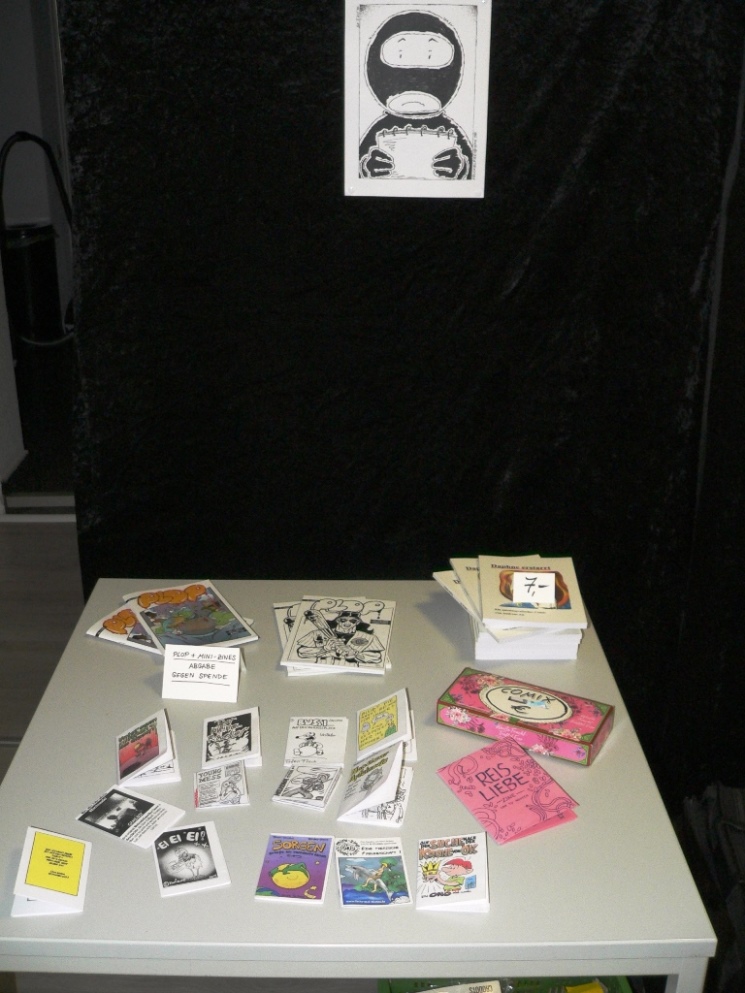 Es gab am 24. September keine Finissage der Ausstellung; dafür lief sie noch bis 28. September weiter. An den letzten Tagen kamen dann noch einige Besucher, vor allem Bekannte von ihr. Der Betreiber der Hauptpassage in Rheydt, wo das Ganze stattfand, habe von begeisterten Rückmeldungen von Besuchern berichtet. An dem Comictisch, der oben zu sehen ist, sind etwa 100 Euro an Einnahmen eingegangen. Leider kann ich nicht sagen, wie viele Comics verkauft wurden. Das Geld soll im Wesentlichen an das Passagenmanagement gespendet werden.