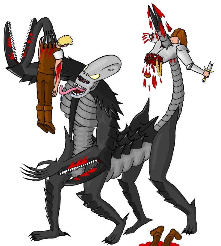 Wo ich gerade bei dem fiesen Monster bin,... wie sieht das eigentlich mit Gewaltdarstellung hier im Forum aus? Mir ist bei der Zeichnung ein bisschen der Blut- und Gedärmstift ausgerutscht und hab keine Ahnung wie brutal das coloriert aussehen wird.