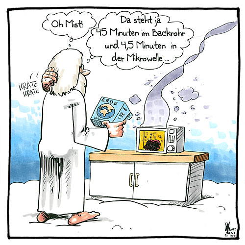die idee hatte ich aber eigentlich, weil in einer der vielen firmen, bei denen ich schon in lohn und brot stand, hatte ich einen kollegen, der war ein absoluter antikoch. der hat sich einmal tiefkühllasagne in der mikrowelle gemacht und die garzeit fürs backrohr eingestellt. da hats dann ordentlich gequalmt!
