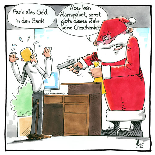 Die Idee mit dem Bankräuber-Weihnachtsmann hatte ich nämlich schon vor Jahren, habe sie aber nie umgesetzt und wollte den Cartoon eigentlich als Beitrag für den anstehenden Adventskalender präsentieren. Na egal, unsere beiden Versionen unterscheiden sich ja Gott sei Dank deutlich und damit kann ich im Endeffekt auch gut leben. Sehr schick übrigens.
