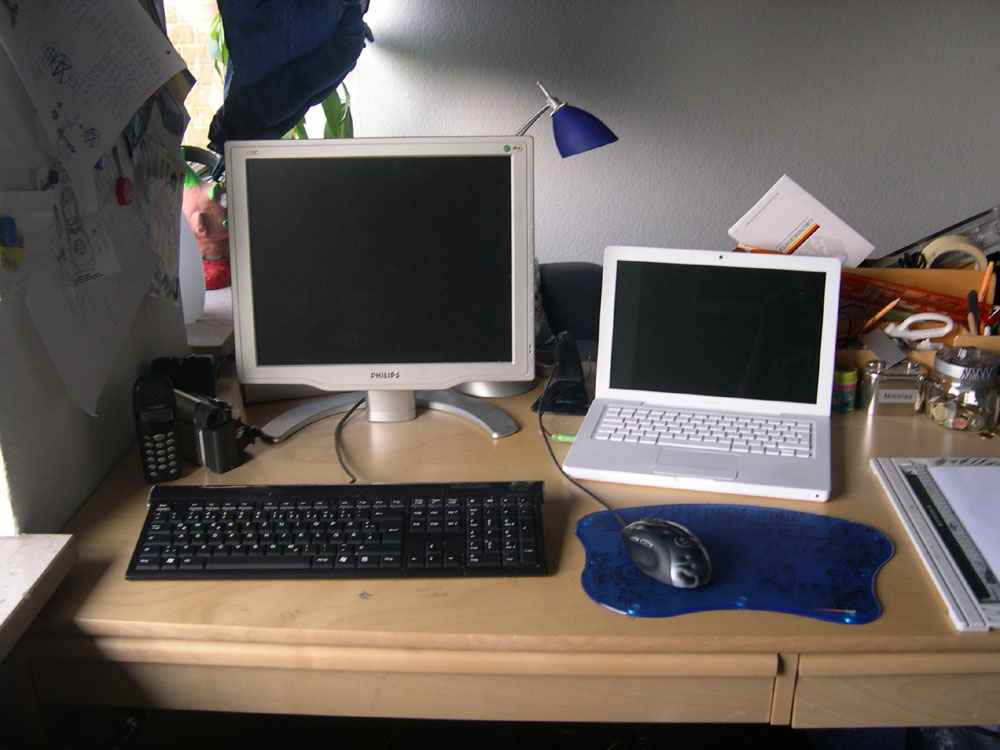 So sieht mein Schreibtisch aus, das Foto gibts schonmal in einem anderen Thread aber egal. :D