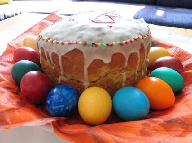 Hier seht ihr typisch russisches Osterzeuchs, eine Art Kuchen (heißt Kuliitsch) und Eier drumrum =)
