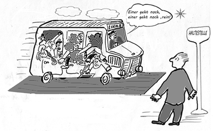 Aber schau Dir mal Bilder von vollen Bussen etwa in Zentralafrika an oder Indien. Da hängen sich Leute noch außen an die Tür oder setzen sich aufs Dach.