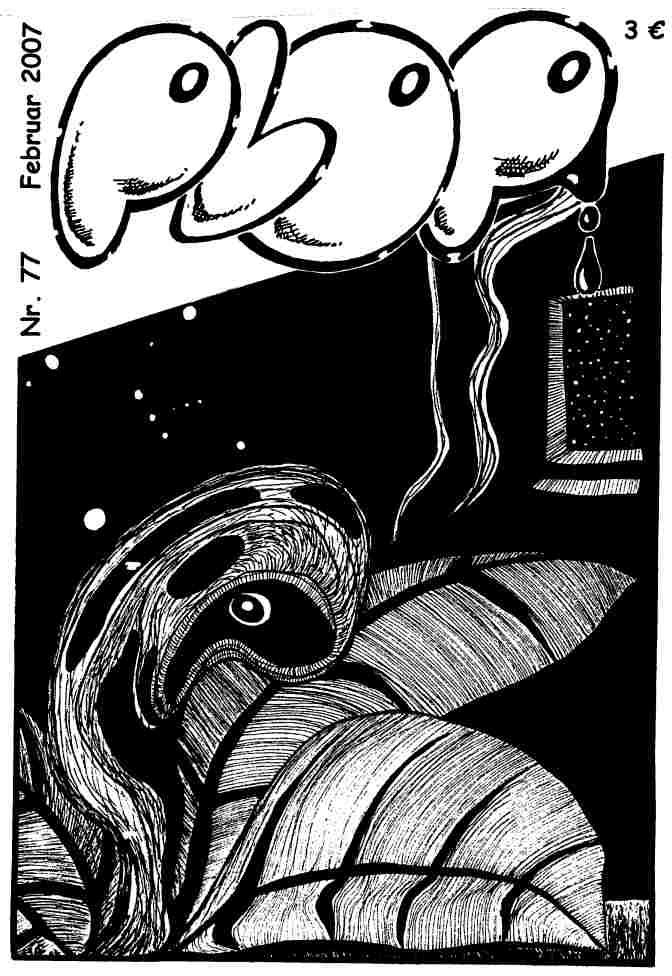 So wird übrigens das Cover der regulären PLOP-Ausgabe aussehen (das erste Mal, daß kein Mensch oder Tier auf dem Cover ist, sondern eine Pflanze - Teresa Camara Pestana nannte ihre Zeichnung: "Nächtliche Pflanze, etwas giftig").
