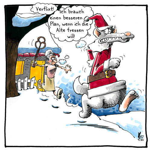 Jaja, Wölfe die aufrecht laufen und Weihnachtsmann-Klamotten tragen, schon klar, Karl, das ist gar kein Cartoon sondern eine dokumentarische Momentaufnahme aus dem Leben eines Wolfes ...