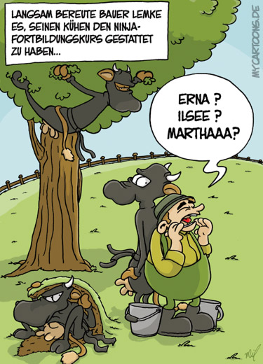 Ninja Kühe! Da muss einer erstmal drauf kommen :D Ich finde den Cartoon spitze, genau mein Humor und Geschmack :D Weiter, weiter!