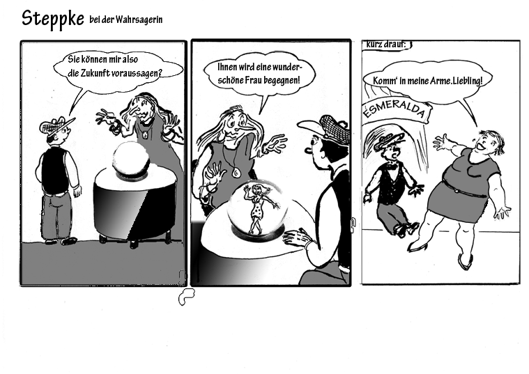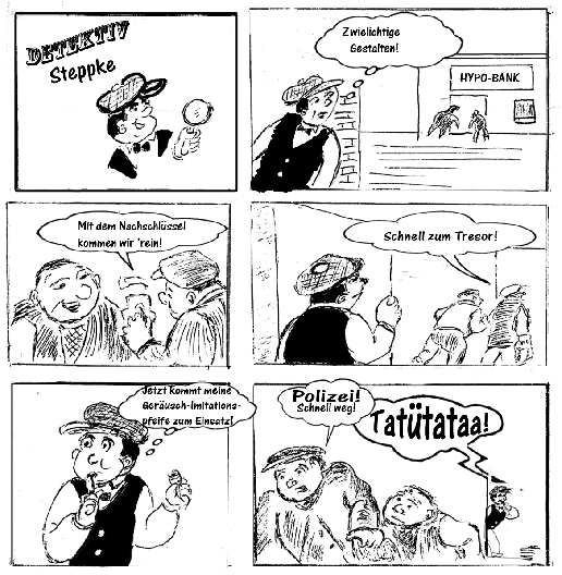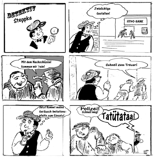 Lustig. Aber mit Panel Nr. 3 komme ich nicht ganz klar. Das Schloss scheint mir ohne Tür drumrum zwischen den beiden zwielichtigen Gestalten zu schweben... ?(