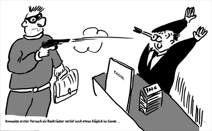 Ja, nicht übel. Eine Bildunterschrift braucht man da wohl schon. Ich hätte die eher so formuliert: "Romuald hatte das Handbuch für Bankräuber vielleicht doch etwas zu schnell überflogen."