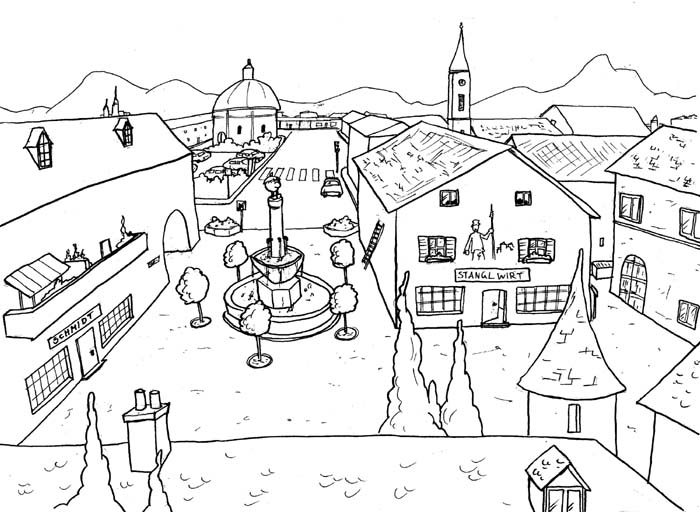 Hab erst eine alte Skizze auf meinem Schreibtisch gefunden. Das hab ich mal versucht ein richitg großes Bild zu zeichnen (und mich ein bisschen an unserem Rathausplatz orientiert :D ) is aber nicht so besonders geworden. Die Dächer gefallen mir irgentwie nicht :rolleyes: