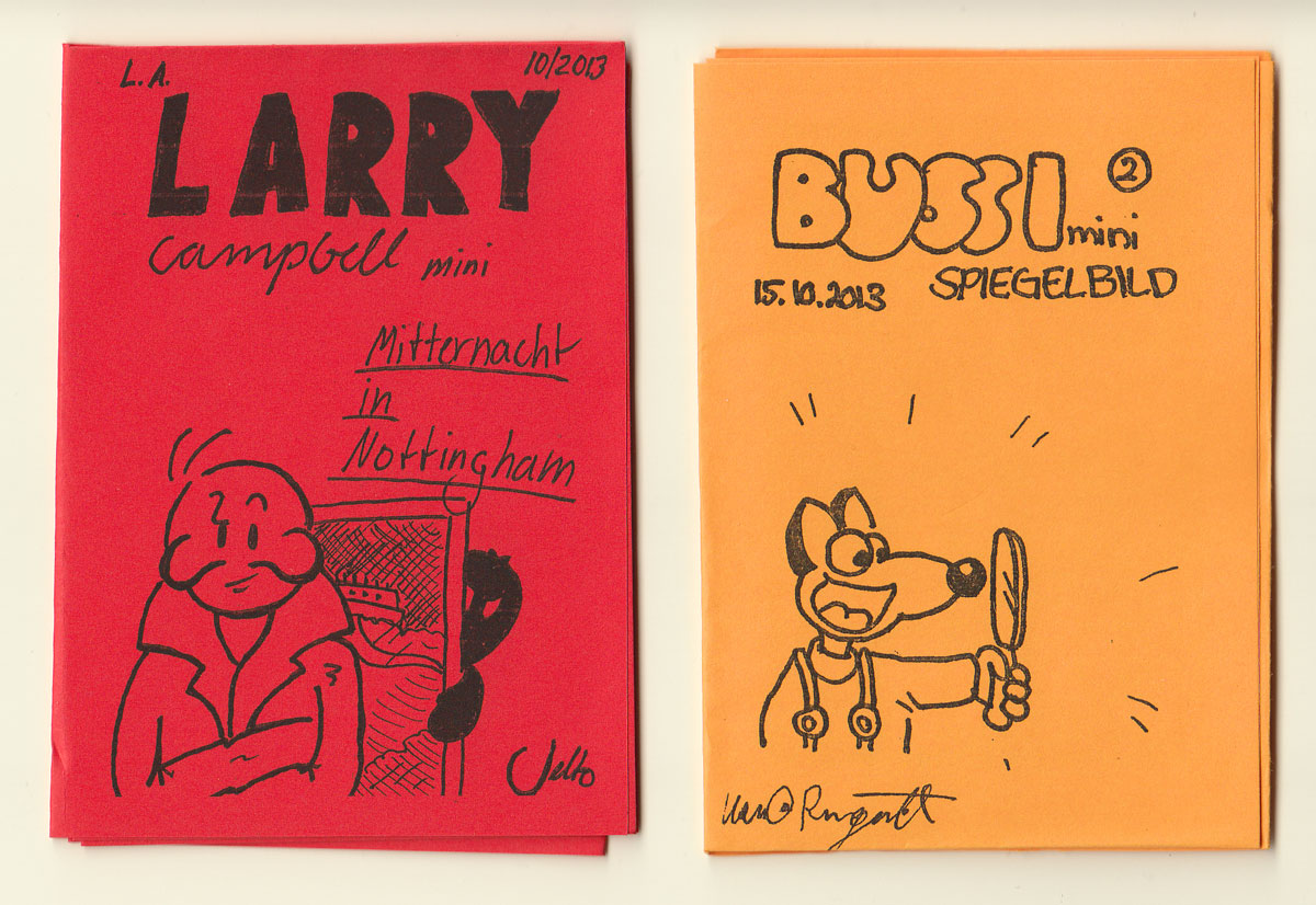 Auffallend war, dass einzelne Mütter und Väter sofort Feuer fingen und ihre Kinder herbeiriefen: "Guck' mal! Das ist doch was für dich." Manchmal teilten die Kinder die Begeisterung, manchmal nicht. Mehrere im Grundschulalter holten sich noch ein- oder zweimal eine der Blanko-Vorlagen, um sofort was zu zeichnen. Das war wohl vor allem meiner Freundin zu verdanken, die einen spontanen kleinen Faltworkshop mit den Kindern veranstaltete. Rückmeldung auf einzelne Heftchen gab es eigentlich nie, aber ich wage zu behaupten, dass die meisten gleich zum BUSSI-Mini-Zine von Keno Ringena (kritzler) griffen und zu Hartmut "Haggi" Klotzbüchers (Der Hartmut) "Auf der Suche nach der Krone von Ök".
