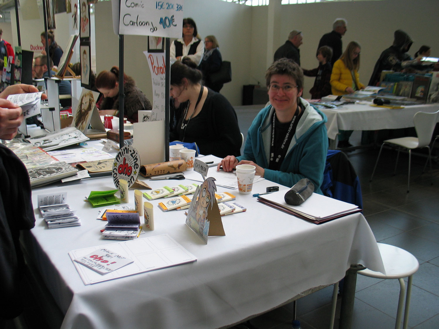Wir hatten mit oho! nicht so viel Aufmerksamkeit wie die Verlags- und Händlerstände und die Künstler, denen man Originale abkaufen und bei denen man Zeichnungen beinahe von jetzt auf gleich in Auftrag geben konnte. Weder die typischen Sammler noch die jugendlichen Manga-Fans und Cosplayer fuhren besonders auf oho! ab. (Überraschung!!) Es gab einige wenige Zeichnerkollegen, die am Stand hängen blieben, weil ihnen die Idee sehr gefiel und die auch was mitgenommen haben. Dass sie mitmachen werden, hat keiner von ihnen gesagt. :( Allein dem Werner Berres (einem der beiden Brüder vom Magazin ZEBRA aus Köln) entfuhr die erschrockene Bemerkung: "Ohje, wir haben ja immer noch kein Heftchen für dein Projekt gemacht!" (Ja, ja, habt nur ein ordentlich schlechtes Gewissen, recht so. Harhar! :evil: ) Burkhard Ihme (vom ICOM - Interessenverband Comic) schwante gleich, als ich ihm das Konzept vorstellte, das man da ja schön viel zu falten habe. :)