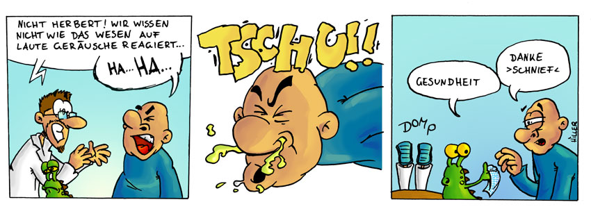 Die Schleimeruption im zweiten Bild. Wenn der Zeichner/Autor auf ein Detail so großen wert legt, erwarte ich als leser eigentlich, dass dieses Detail im Schlussbild eine wichtige Rolle spielt; das tut es bei dir nicht, und daher war ich etwas irritiert.
