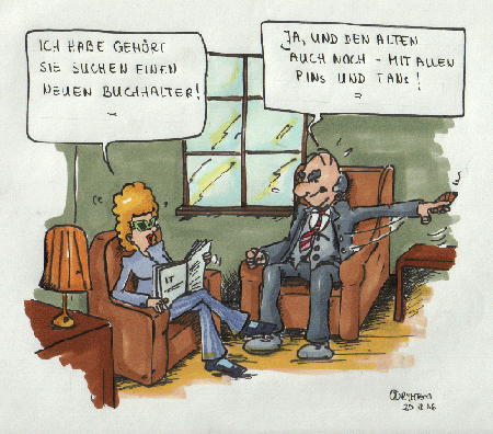 Das zweite Bild zeigt, das ein chef noch seinen alten Buchhalter sucht mit allen Pins und Tans.
