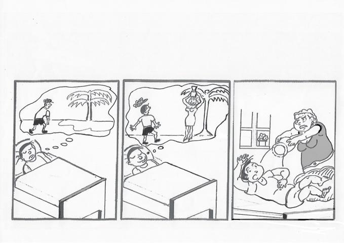 Streng genommen gibt es natürlich ein Problem: Woher weiß "sie", was "er" geträumt hat? Aber das hat mich nicht irritiert. Ich denke, man kann hier auf die Traumblase verzichten - es spricht vielmehr für die Intensität des Traums, wenn der die ganze obere Bildhälfte einnimmt. Und dann akzeptiert man auch, daß die holde Gattin von dem Traum nicht so begeistert ist.