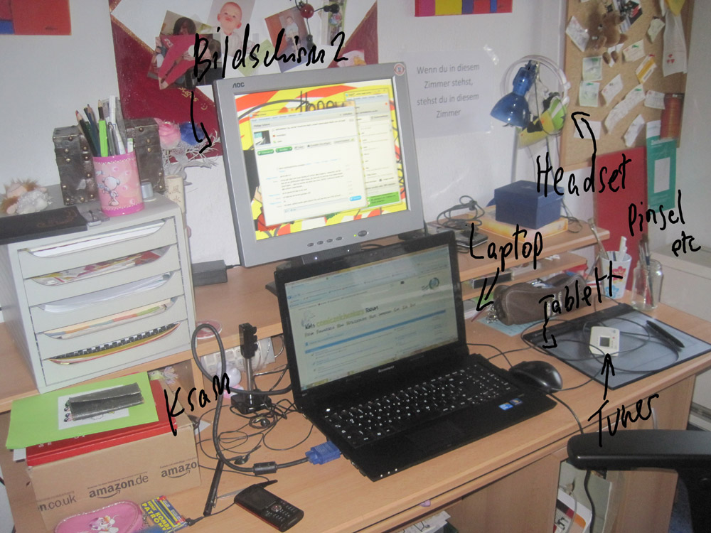 In der Mitte mein Grafiktablett, das, wenn ich "reell" zeichnen will, auf dem "Sonstwas-Turm" klettern muss...