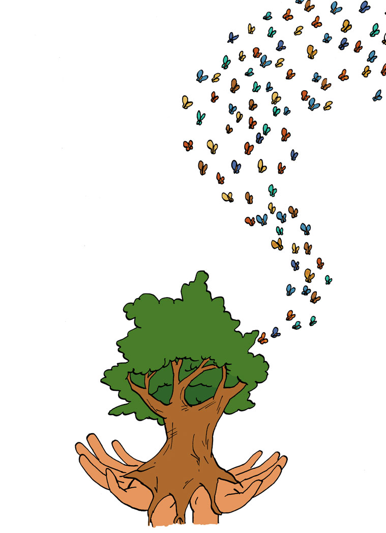 Also erstmal find ich das ne sehr schöne idee, aberr.... Hiller ich würde die Schmetterlinge größer machen, die sehen aus wie Fliegen, die können ruhig in der Proportion nicht zu dem Baum passen, aber es geht hir um Symbolik ich finde nciht, dass das rüber kommt. Auch wenn du es bereits abgelehnt hast finde ich Daniels Version viel viel passender. Dadurch wurde das Bild zu was ganz besonderem. Ich finde du solltest dir das nochmal überlegen und nicht weil du schon so weit fertig bist es so lassen.