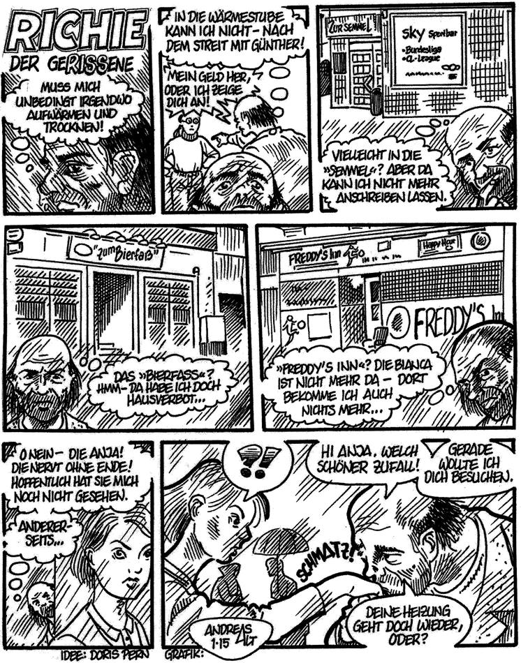 Übrigens: Wenn Ihr wollt, dann schreibt mal was zur Farbgebung. Doris Pern hat einige meiner "Richie"-Comics getextet und ist als Dekorateurin künstlerisch angehaucht. Aber sie hatte noch nie einen Comic mitgestaltet. Die Urteile würden sie bestimmt sehr interessieren.