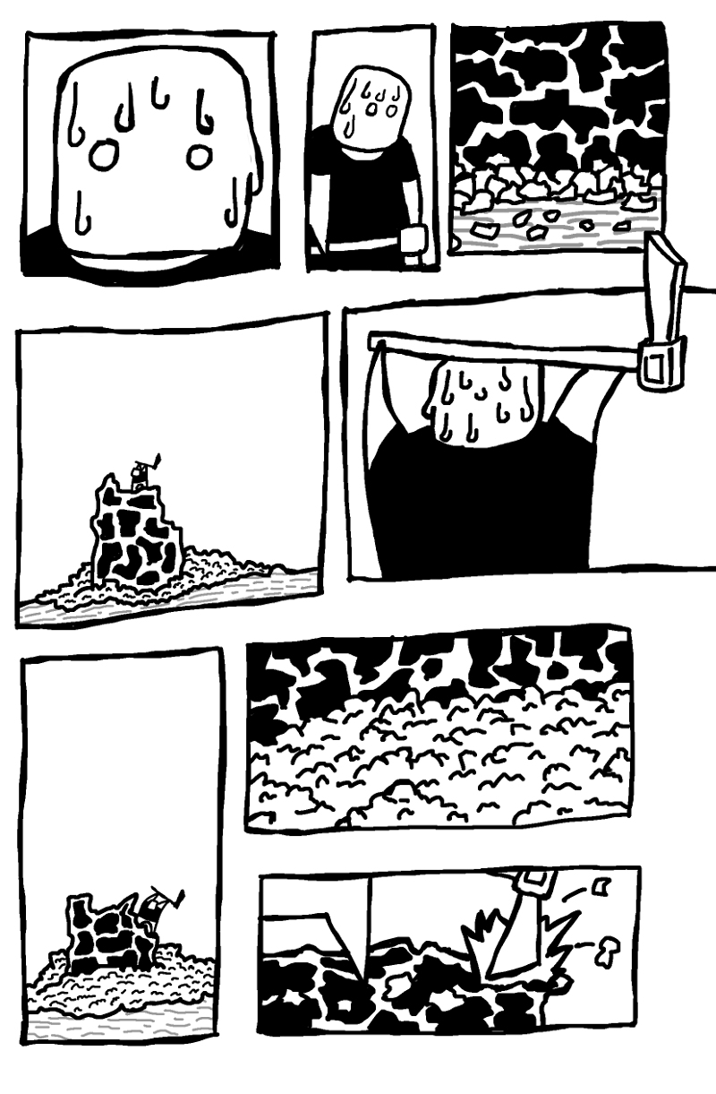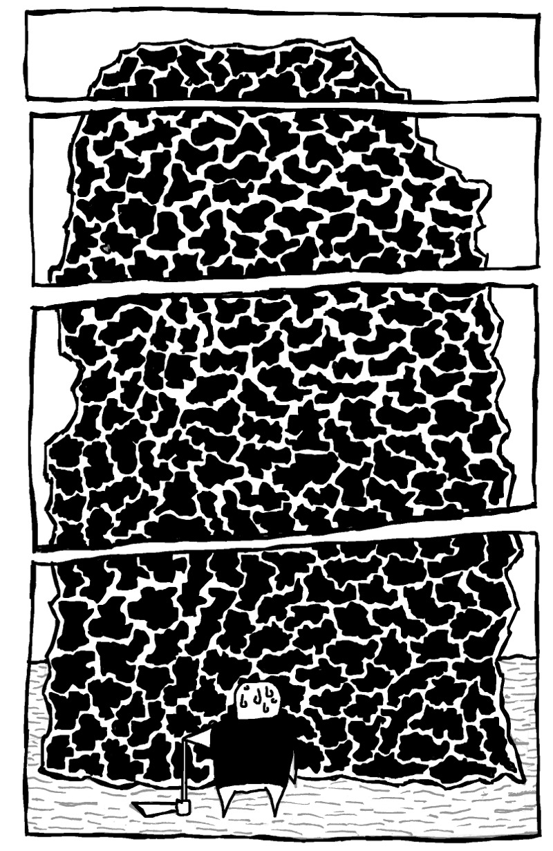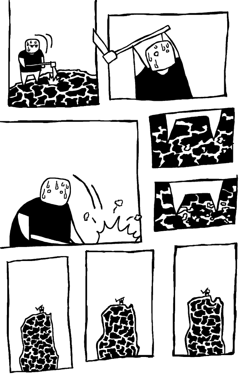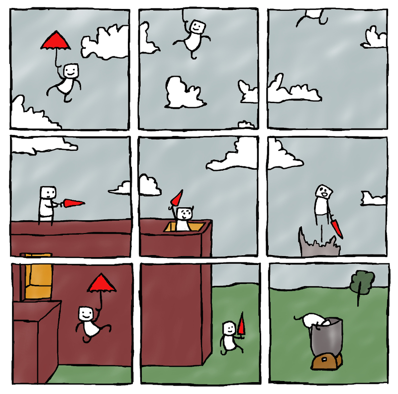 Ein sehr interessanter Ansatz, der mir gut gefällt (wobei die Handlung in der richtigen Reihenfolge auch nicht wirklich "Sinn" ergibtDie Idee dahinter war zu zeigen, dass die Comicfigur (er fernsehende) im Comic gefangen ist, während der leser fast mühelos die echt Bedeutung der Bilderfolge erfassen kann.