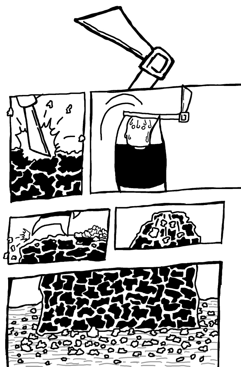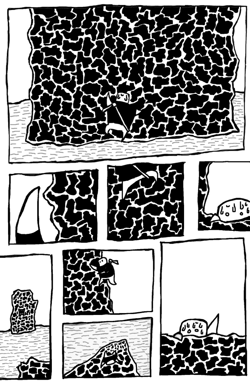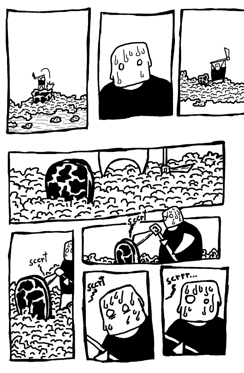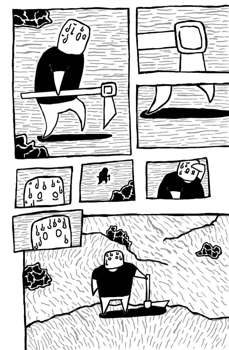 Ein sehr interessanter Ansatz, der mir gut gefällt (wobei die Handlung in der richtigen Reihenfolge auch nicht wirklich "Sinn" ergibtDie Idee dahinter war zu zeigen, dass die Comicfigur (er fernsehende) im Comic gefangen ist, während der leser fast mühelos die echt Bedeutung der Bilderfolge erfassen kann.