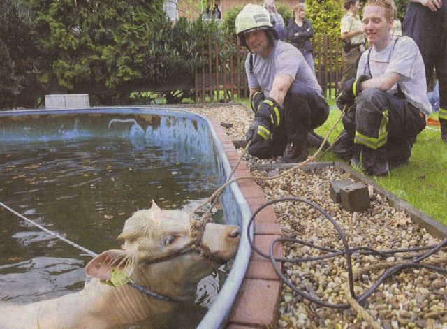 Gestern ist einem Bauern eine Kuh ausgebüchst, durch die halbe Stadt (naja, übertreiben wir mal nicht, durch das halbe Dorf) gerannt und ist in einen Pool in der Nachbarschaft gefallen. Nach viel lautem Muhen wurde sie endlich bemerkt und mit Hilfe von Feuerwehr und Tierarzt rausgeholt.