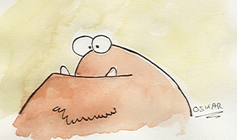 Du zeichnest einfach ein paar Striche die aussehen wie ein Monster ( aus mehr als Augen und Mund betehts ja eigentlich nicht) mit Finliner auf Aquarell-Papier. Kurz Trocknen lassen und dann mit viel Wasser und wenig Farbe drüberpinseln. Von einer Seite "auf die andere" rüber- ausmalen, dann wird eine Seite ein bisschen heller weil nicht mehr soviel Farbe am Pinsel ist.