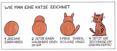 Aber noch was wichtiges: Die Idee zu "Wie zeichnet man eine Katze" ist nicht von mir, sondern vom Amerikaner B. Kliban!! Obwohl ich die Idee sehr schön fand, gefiel mir die Umsetzung von Kliban nicht so richtig, und ich hatte mir vorgenommen, mal selbst eine Version zu machen... (Der Vorsatz steht immer noch; das da unten gilt nicht ;) :D)