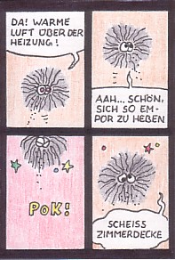 Cartoons sind ja nett, aber eigentlich möchte ich ja viel lieber Strips machen... Also ist die Herausforderung, einen Strip auf DIN A8 unterzubringen ;) Das unten ist ein erster Versuch. Inhaltlich eine alte Stripserie von mir, die "Flusen" heißt und, na ja, um Staubflusen geht ;) Coloriert aus Spaß mit Buntstift, und weil das nicht aussah, kam noch ein schwarzer Rahmen rum :)