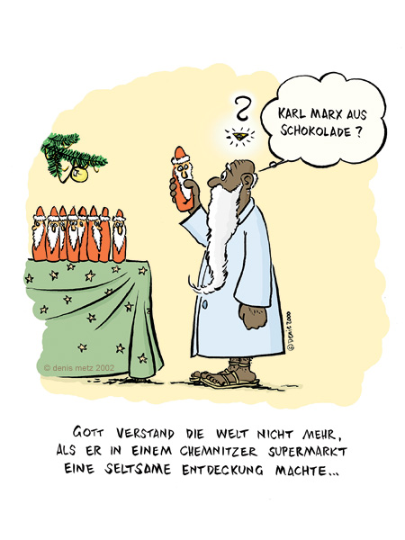 Ich musste mich letztes Jahr für meine kirchliche Trauung noch nachträglich taufen lassen - als erwachsener Mann. Hab dem Pfarrer erzählt, dass ich Cartoons zeichne und daraufhin hat er seine Predikt mit meinen Cartoons gemacht, die er dann per Overheadprojektor in der Kirche präsentiert hat. Die Auswahl der Cartoons hab ich ihm überlaassen - hätte ich mich selbst nicht getraut, aus Angst die anderen Gemeindeglieder zu verprellen.