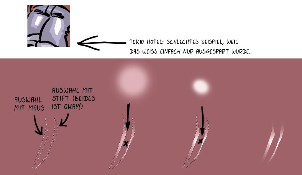 Wie ziehst Du z.B. die Auswahl zum Füllen mit Farbe "Weiß" bei der Hose von dem zweiten Typen von rechts. Das sieht so einfach (aber genial) aus, ich zumindest brech mir da aber echt einen bei ab und bekomms trotzdem nicht hin...