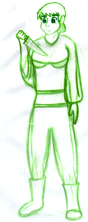 Der Oberkörper ist nicht zu lang, sondern eher zu kurz, könnte einen halben Kopf länger sein und auch noch breiter. Die Schultern sind nicht breit genug und perspektivisch falsch dargestellt (vBa linke Schulter ist nicht in der Frontansicht, wie der restliche Körper). Der Kopf ist zu klein. Der Kopf wird nach oben hin auf einmal gestaucht. Der vBa linke Arm ist auch nicht ganz korrekt. Der Unterarm ist um ein vielfaches länger als der Oberarm. Die Hand wirkt auch falsch (mach mal eine Faust, sieht anders aus, oder? ;)) Das Messer , das sie hält, ist aus dem Profil gezeichnet, müsste aber eine andere Perspektive haben, wenn sie das Messer schräg nach vorne hält. Der andere Arm ist kürzer als der andere.