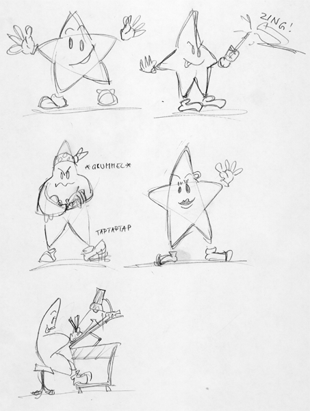 Mir sind doch glatt ein paar Ideen gekommen. Und zwar, dass man den toonigen Stern als solchen beibehält, also weder Beine noch Arme an ihm anmontiert, sondern stattdessen zwei weisse Handschuhe und zwei helle Schuhe zur Verfügung stellt, die immer an der entsprechenden Stelle des Stern "schweben".