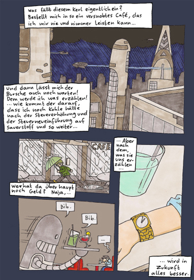 wir können uns ja nächstes jahr einfach irgendne abgefahrene, surrealistische story ausdenken, die nichts mit dem thema zu tun hat. einer nimmt dann wachsmalstifte und kritzelt mit der linken hand (oder mit der rechten falls er linkshänder ist) irgendwas aufs papier das entfernt an ein comic erinnert - damit gewinnen wir garantiert! ;)