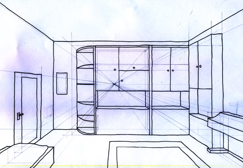 ich hab nen runden flügel im zimmer (wo sind da die geraden fliehenden linien?), wie zeichnet man ein bücherregal? ein bett in einer ecke?