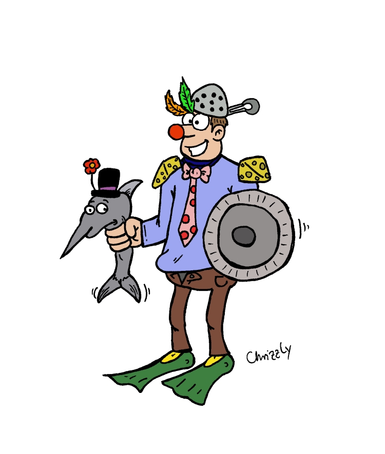 So wie versprochen mein Krieger der die anderen durch Lachen bezwingt. Mit einem Schwertfisch mit Zylinder und Blume gerüstet, und einem Sieb als Helm kann ihn niemand mehr besiegen.