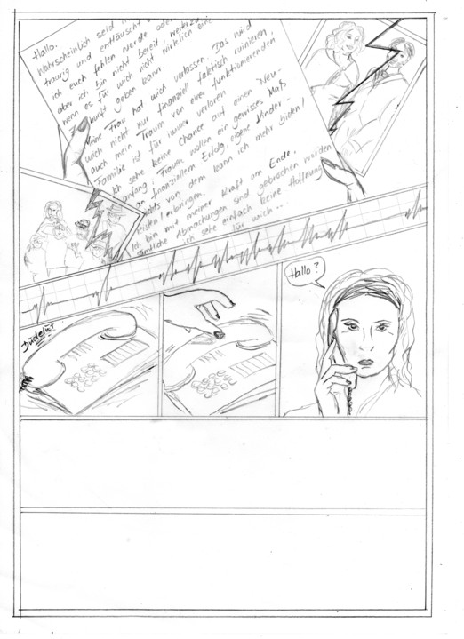 Nachdem ich die 3. Seite nun bereits dreimal umskizziert habe, sieht das Layout trotzdem nicht wirklich so aus, wie ich es mir vorstelle (mal ganz abgesehen davon, dass es in Variante 4 gemacht wurde...) und außerdem ist es erstaunlich emotional anstrengend, just diese Szene zu gestalten!