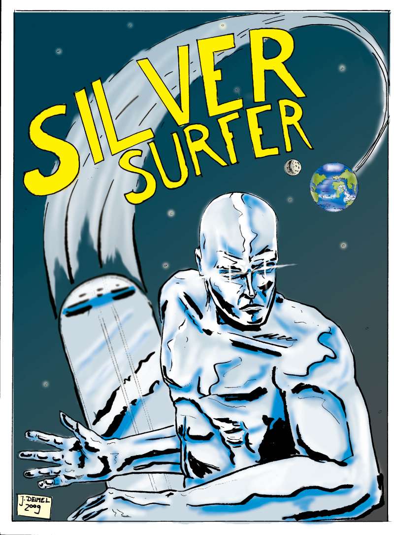 Es sieht nicht so aus, als ob der Silversurfer auf seinem Brett steht. Wenn du seine Beine im Geist verlängerst, wirst du merken, daß man bei dem Ausschnitt das Brett gar nicht sehen kann.