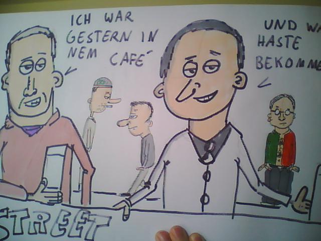 Schön, der Gag gefällt mir. Ich würde eventuell offene Münder zeichnen, schließlich sagen die beiden ja was. Und die beiden eventuell etwas tun lassen. So stehen sie ja nur da. Du hättest sie ja zum Beispiel in die Kneipe an den Thresen verpflanzen können, wo beide schon ein wenig angesoffen sind.