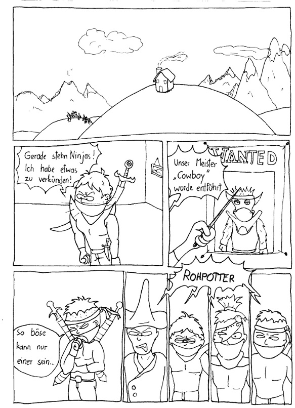 Hier sind die Charaktere und die eine Seite die ich bisher gezeichnet habe. Aber ihr müsst mir bei der Namenauswahl helfen wir fallen einfach keine passenden Namen ein. Und ihr seht ihr einen Knochenmagier aber seine Gestalt ist nicht immer so sondern er ist ein ganz normaler Mensch am Tag. Es weiß aber keinen von den Charakteren das das der Typ ist der ihnen hilft herauszufinden wo die Roboter ihren Ninjameister (die Kuh) versteckt haben. Könntet ihr mir auch vielleicht helfen diesen Menschen zu zeichnen der sich in den Magier verwandelt. Ich weiß nämlich nicht wie der aussehen soll . ;(